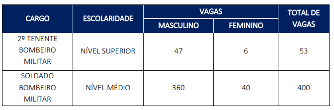 Ao todo serão oferecidas 453 vagas, sendo 400 para alunos bombeiros e 53 para alunos oficiais. No caso de aluno bombeiro, para concorrer será necessário possuir ensino médio, com remuneração inicial de R$ 4.831,43. No caso de aluno oficial, com necessidade de nível superior, o inicial será de R$ 12.468,18.