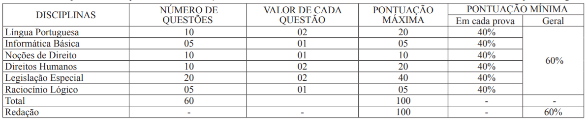 As provas objetiva (múltipla escolha) e discursiva (redação) terão caráter eliminatório e classificatório e serão constituídas conforme o quadro a seguir: