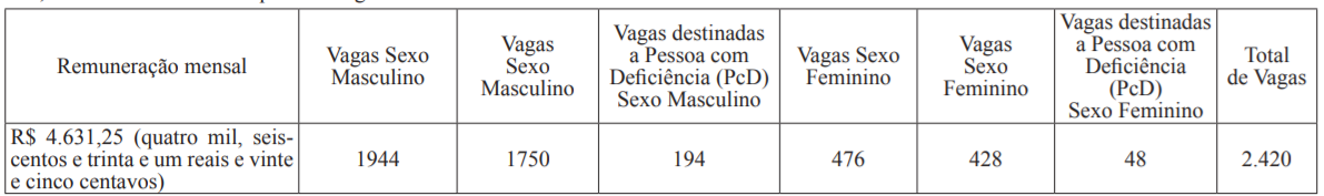 As 2.420 vagas serão distribuídas entre candidatos homens e mulheres e divididas entre ampla concorrência e pessoas com deficiência. Veja o quadro a seguir: