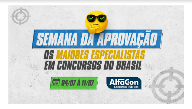 A partir desta segunda-feira, dia 04 de julho, até o dia 11 de julho, teremos a semana da aprovação com os maiores especialistas em concurso do Brasil, que entram em cena em um mega evento com mais de 100 aulas ao vivo e GRATUITO no canal do youtube do Alfacon!